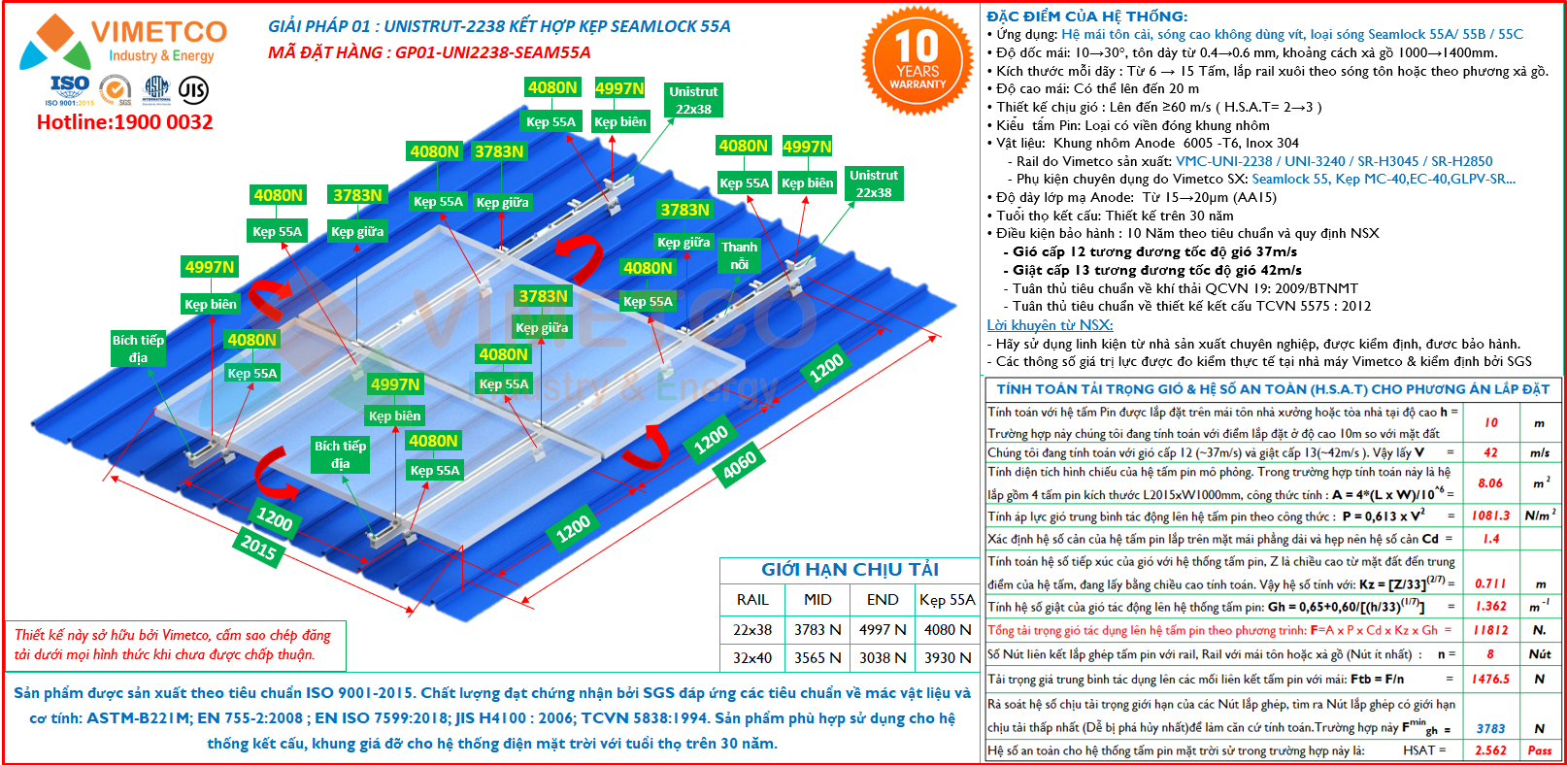 • Thiết kế chịu gió : Lên đến ≥60 m/s (H.S.A.T= 2.0)